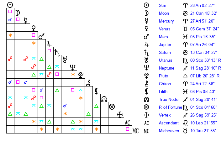| Sun | 28 Aries 2 | 28 Aries 54 | 16 Gemini 19 |