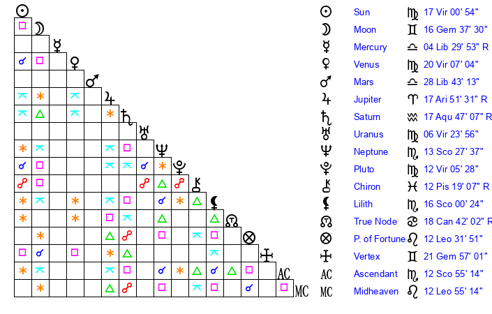 | Moon | 16 Gemini 29 | 24 Aries 19 | 25 Virgo 18 |
