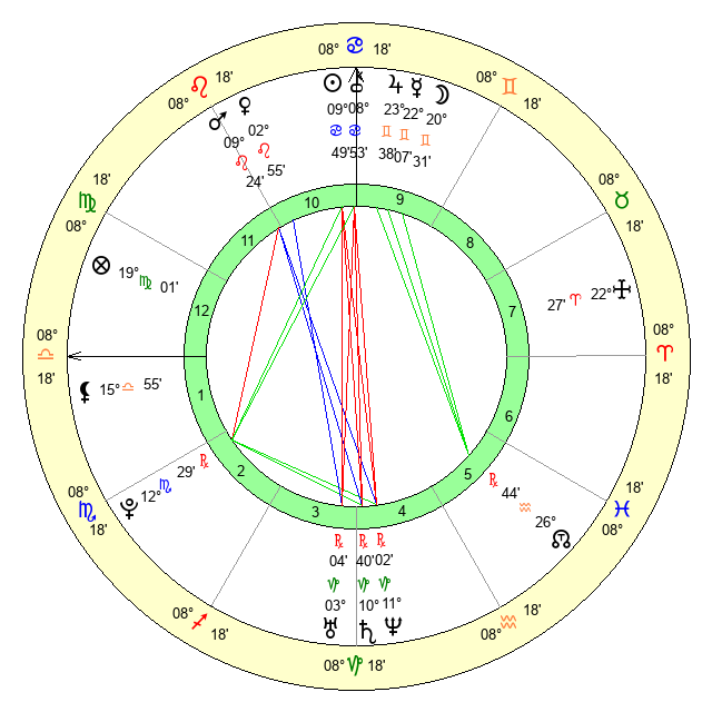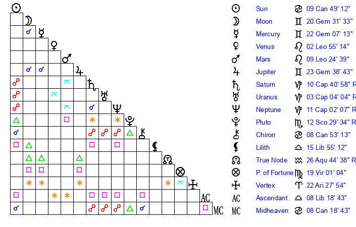 | Jupiter | 23 Gemini 41 | 4 Cancer 59 | 1 Cancer 22 |