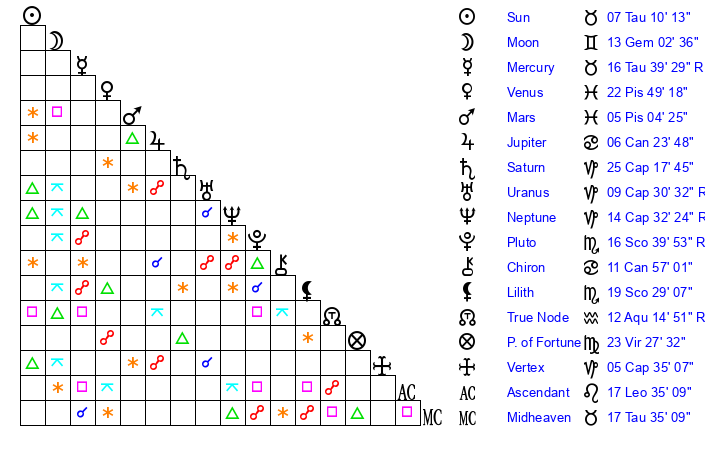 | Sun | 7 Taurus 10 | 7 Taurus 41 | 10 Gemini 56 |