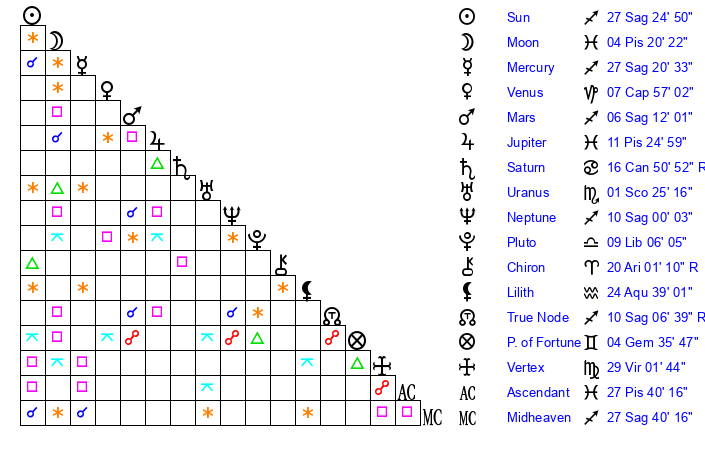 | Sun | 27 Sagittarius 25 | 28 Sagittarius 2 | 19 Aquarius 18 |