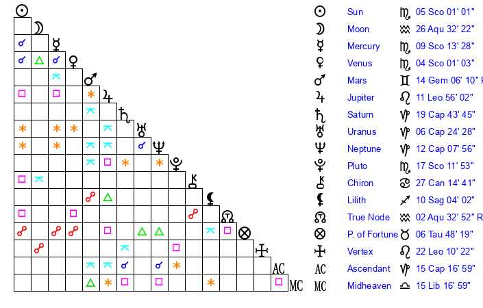| Moon | 26 Aquarius 32 | 24 Capricorn 21 | 15 Gemini 34 |