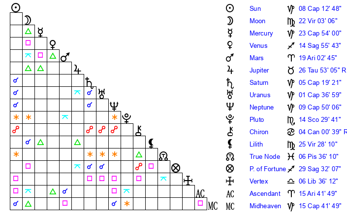 | Moon | 22 Virgo 0 | 23 Sagittarius 43 | 9 Capricorn 58 |
