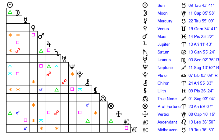 | Uranus | 0 Scorpio 5 | 26 Taurus 19 | 28 Libra 32 |