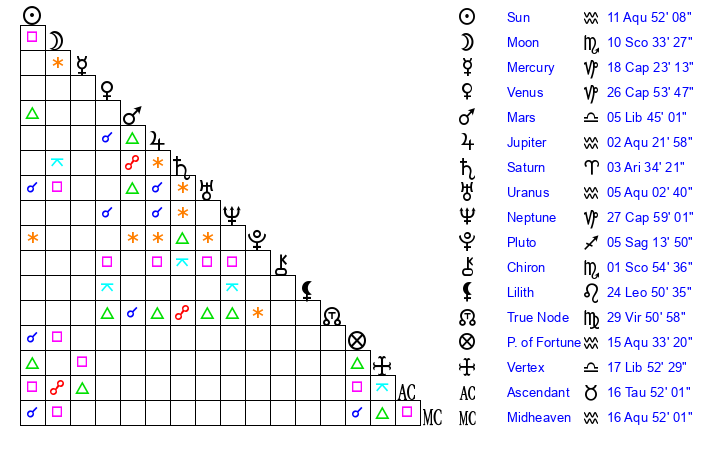 | Sun | 11 Aquarius 52 | 12 Aquarius 4 | 10 Pisces 9 |