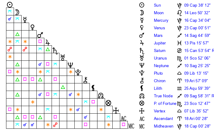 | Venus | 23 Capricorn 1 | 8 Capricorn 50 | 26 Pisces 40 |