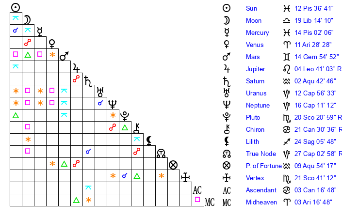 Sun | 12 Pisces 37 | 13 Pisces 22 | 16 Aries 23 |