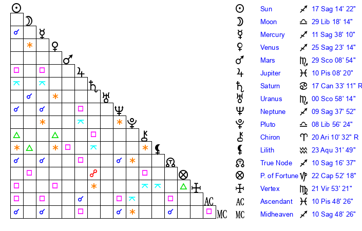 | Neptune | 9 Sagittarius 37 | 29 Pisces 21 | 11 Sagittarius 15 |