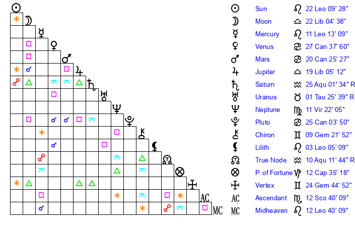 | Sun | 22 Leo 9 | 23 Leo 7 | 21 Scorpio 38 |