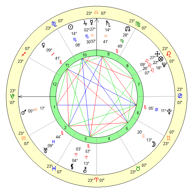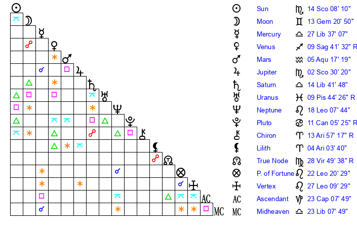 | Sun | 14 Scorpio 8 | 15 Scorpio 24 | 27 Aquarius 39 |
