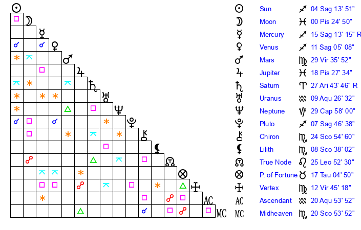 Moon | 0 Pisces 27 | 14 Libra 33 | 14 Aquarius 21 |