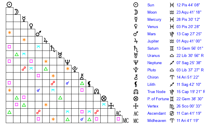 | Sun | 12 Pisces 43 | 13 Pisces 7 | 4 Taurus 7 |