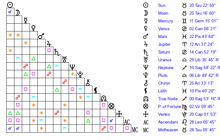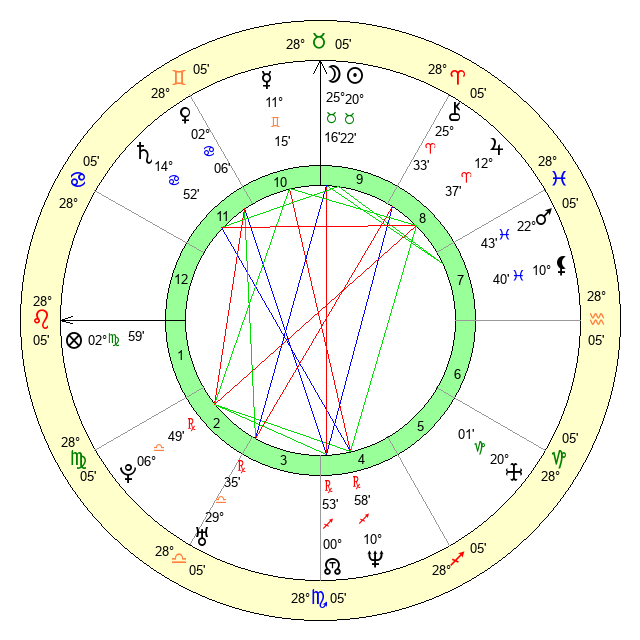 | Moon | 25 Taurus 24 | 10 Scorpio 19 | 27 Pisces 26 |