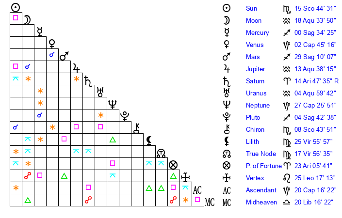 | Sun | 15 Scorpio 45 | 16 Scorpio 12 | 13 Sagittarius 0 |