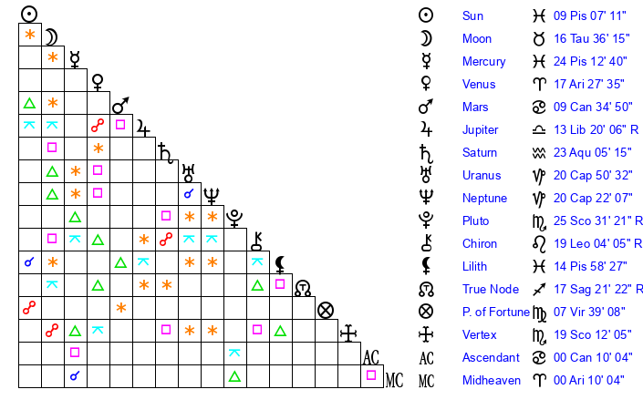 | Moon | 16 Taurus 35 | 4 Pisces 55 | 17 Cancer 44 |