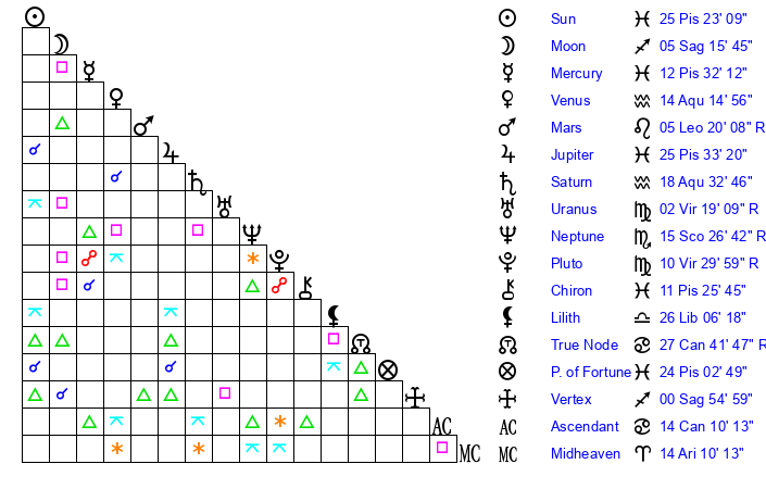 | Venus | 14 Aquarius 15 | 6 Aries 30 | 28 Aries 22 |