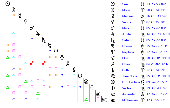 | Mars | 5 Pisces 42 | 18 Cancer 59 | 29 Pisces 58 |