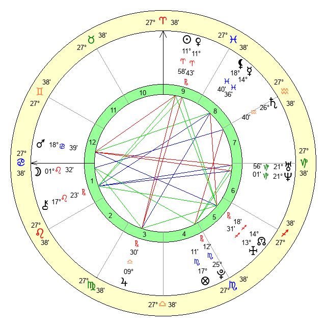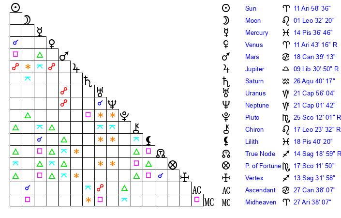 | Venus | 11 Aries 43 | 27 Pisces 13 | 5 Aries 58 |
