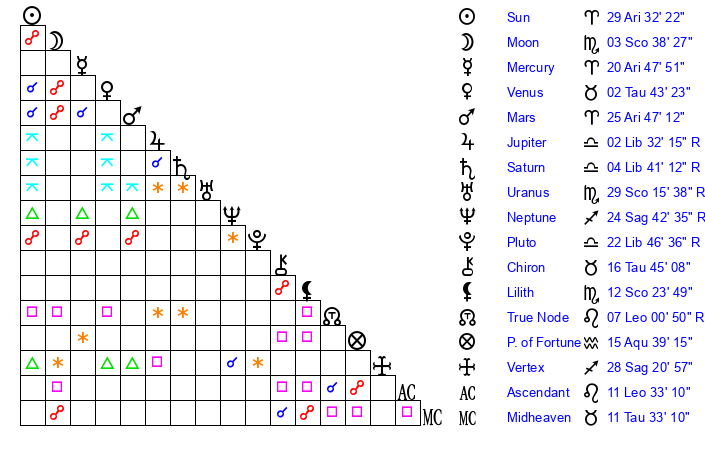 | Uranus | 29 Scorpio 19 | 25 Taurus 43 | 27 Scorpio 34 |