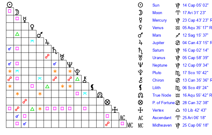 | Saturn | 16 Capricorn 6 | 14 Pisces 45 | 20 Capricorn 8 |