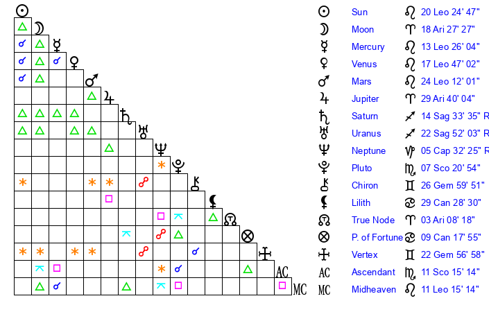 | Moon | 18 Aries 28 | 17 Aries 50 | 29 Leo 58 |