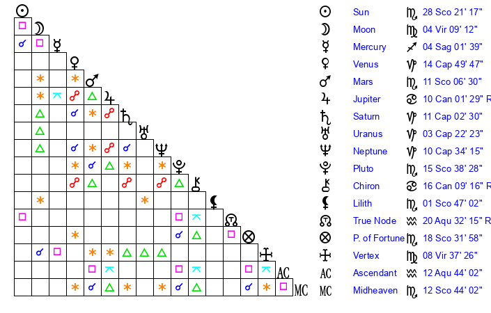 | Pluto | 15 Scorpio 38 | 1 Aquarius 41 | 16 Scorpio 55 |