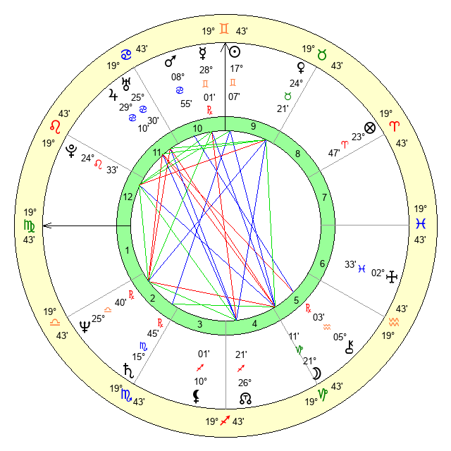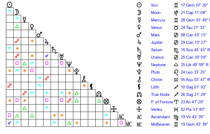 | Mercury | 28 Gemini 1 | 29 Gemini 30 | 5 Virgo 50 |