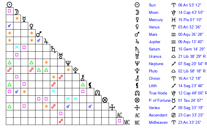 | Saturn | 15 Gemini 32 | 23 Pisces 53 | 20 Gemini 51 |