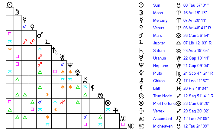 | Sun | 0 Taurus 37 | 0 Taurus 52 | 1 Gemini 36 |