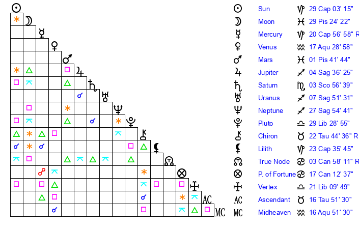 | Mercury | 20 Capricorn 56 | 16 Capricorn 43 | 22 Aquarius 51 |