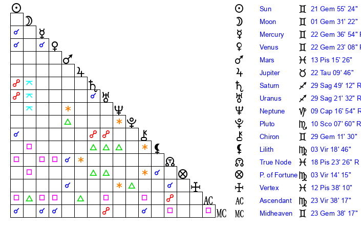| Venus | 22 Gemini 23 | 6 Taurus 35 | 17 Gemini 51 |