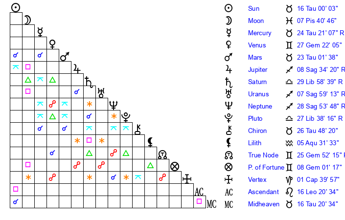 | Sun | 16 Taurus 0 | 16 Taurus 49 | 26 Gemini 20 |