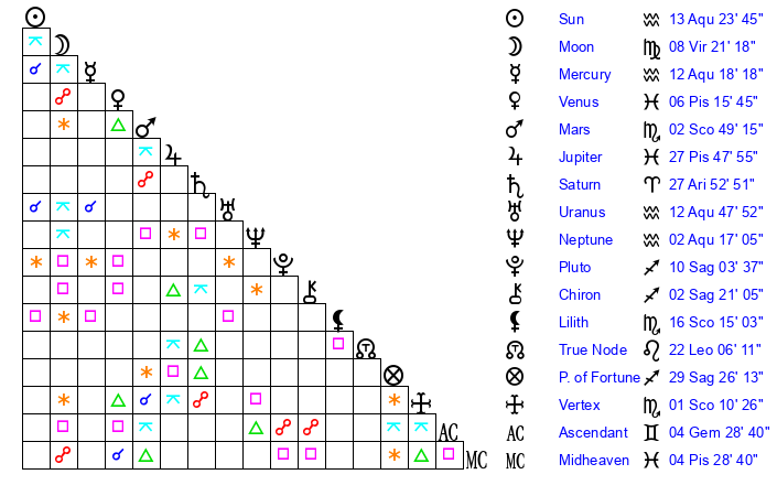 Sun | 13 Aquarius 24 | 14 Aquarius 6 | 9 Pisces 40 |