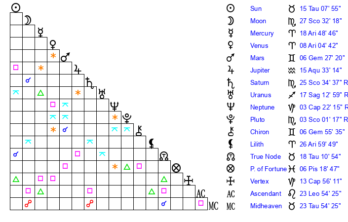 | Moon | 27 Scorpio 33 | 28 Leo 42 | 11 Taurus 12 |