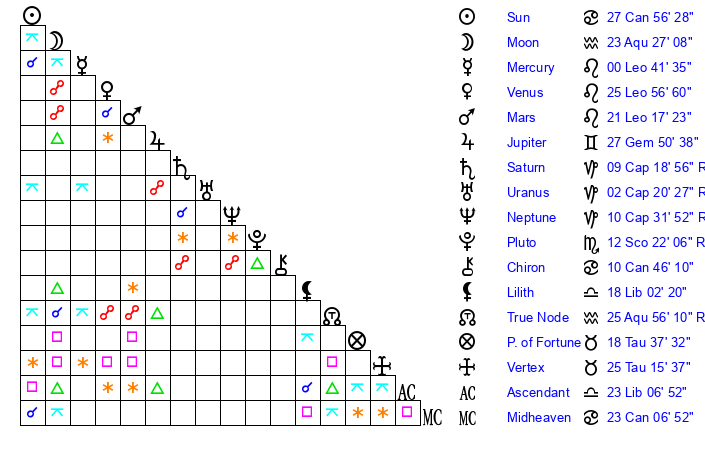 | Moon | 23 Aquarius 27 | 3 Gemini 54 | 26 Gemini 59 |