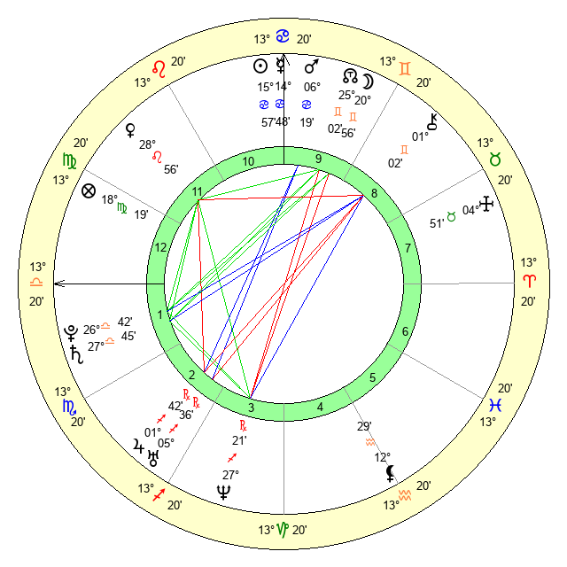 | Mercury | 14 Cancer 50 | 12 Leo 8 | 23 Virgo 30 |