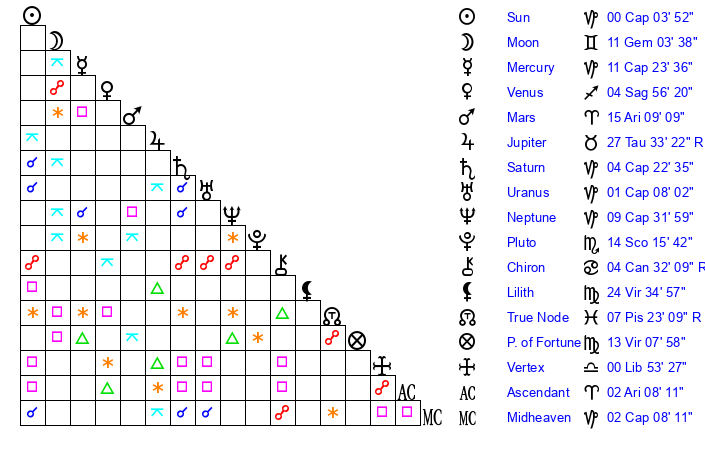 | Sun | 0 Capricorn 4 | 0 Capricorn 5 | 7 Aquarius 45 |