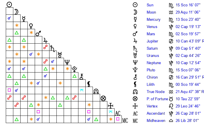 | Pluto | 15 Scorpio 7 | 1 Aquarius 30 | 16 Scorpio 30 |