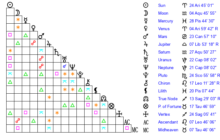 | Venus | 5 Aries 0 | 24 Pisces 42 | 13 Aries 2 |