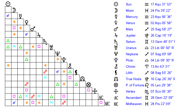 | Moon | 24 Pisces 41 | 2 Gemini 32 | 18 Aquarius 32 |