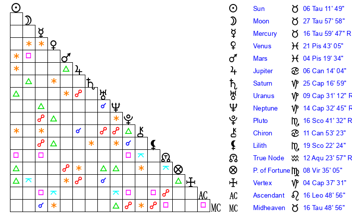 | Mercury | 16 Taurus 59 | 10 Aries 1 | 15 Taurus 32 |