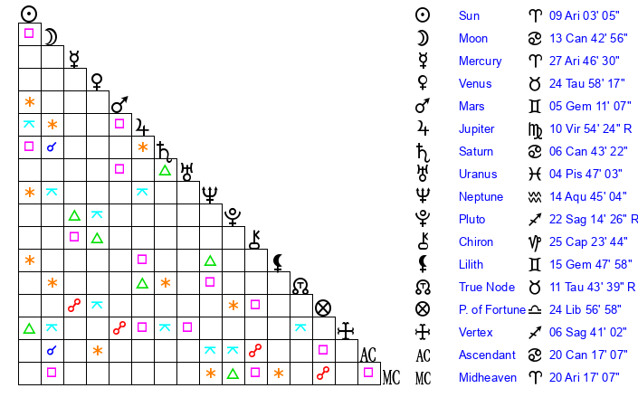 | Moon | 13 Cancer 32 | 8 Aries 24 | 27 Aries 55 |