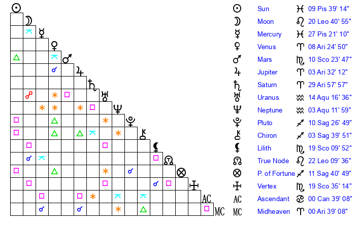 Moon | 20 Leo 38 | 19 Pisces 32 | 4 Leo 15 |