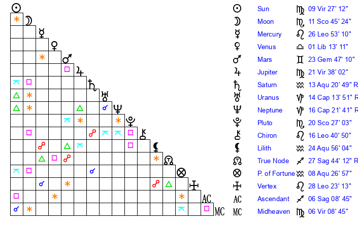| Saturn | 13 Aquarius 18 | 29 Pisces 51 | 11 Aquarius 54 |