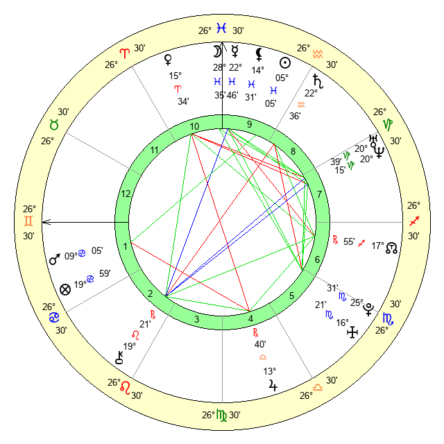 | Moon | 28 Pisces 35 | 9 Capricorn 27 | 26 Taurus 0 |
