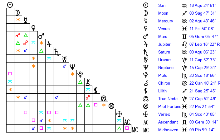 | Saturn | 0 Aquarius 7 | 18 Pisces 6 | 3 Aquarius 40 |
