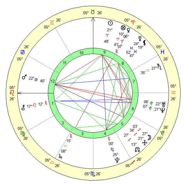 | Venus | 6 Aries 8 | 24 Pisces 40 | 11 Aries 5 |
