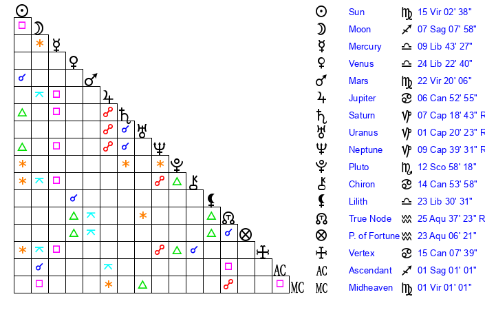 | Sun | 15 Virgo 2 | 15 Virgo 19 | 20 Libra 20 |