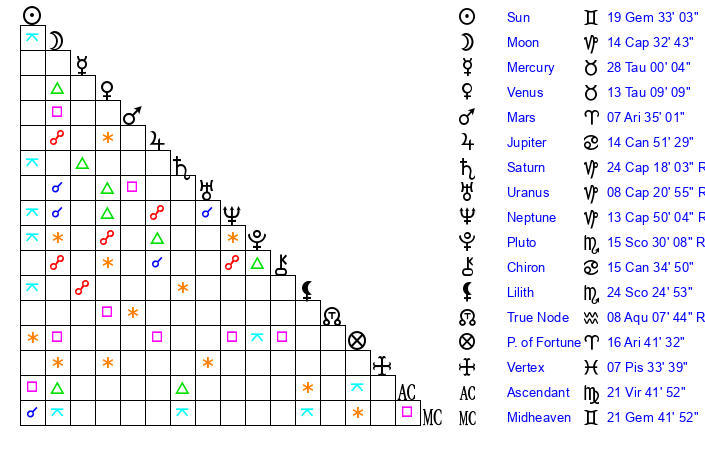 | Moon | 14 Capricorn 37 | 13 Sagittarius 11 | 26 Aries 4 |