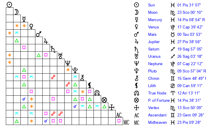 | Moon | 23 Scorpio 1 | 1 Sagittarius 51 | 24 Aries 0 |